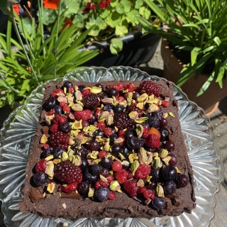 Zomerse zoete aardappel brownie met zomerfestival en pistachenoten