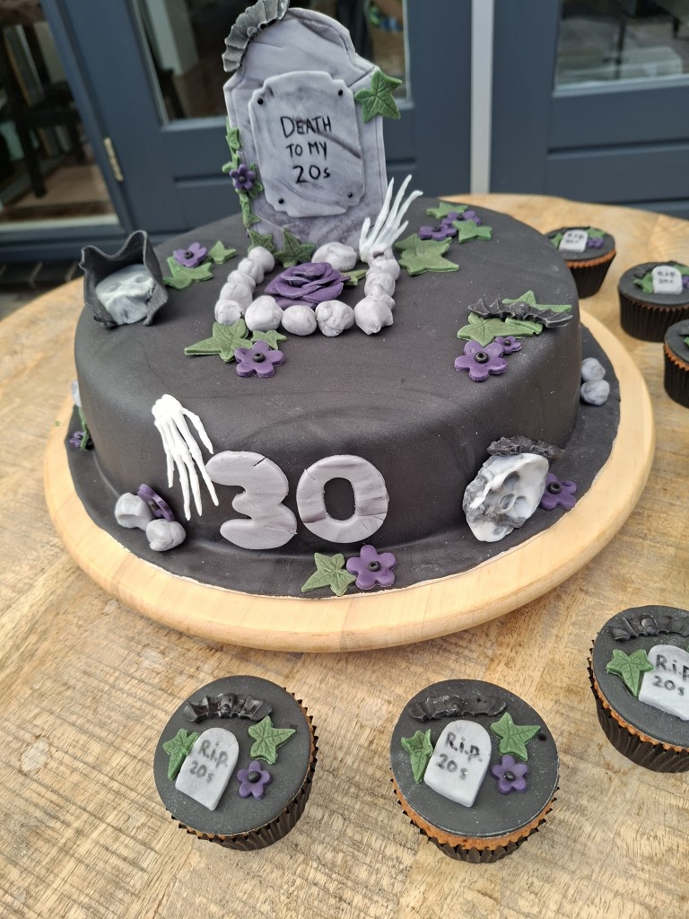 Deze super gave gothic taart is gevuld met een laagje jam en slagroom. De cupcakes maakte ik matchend bij de taart.