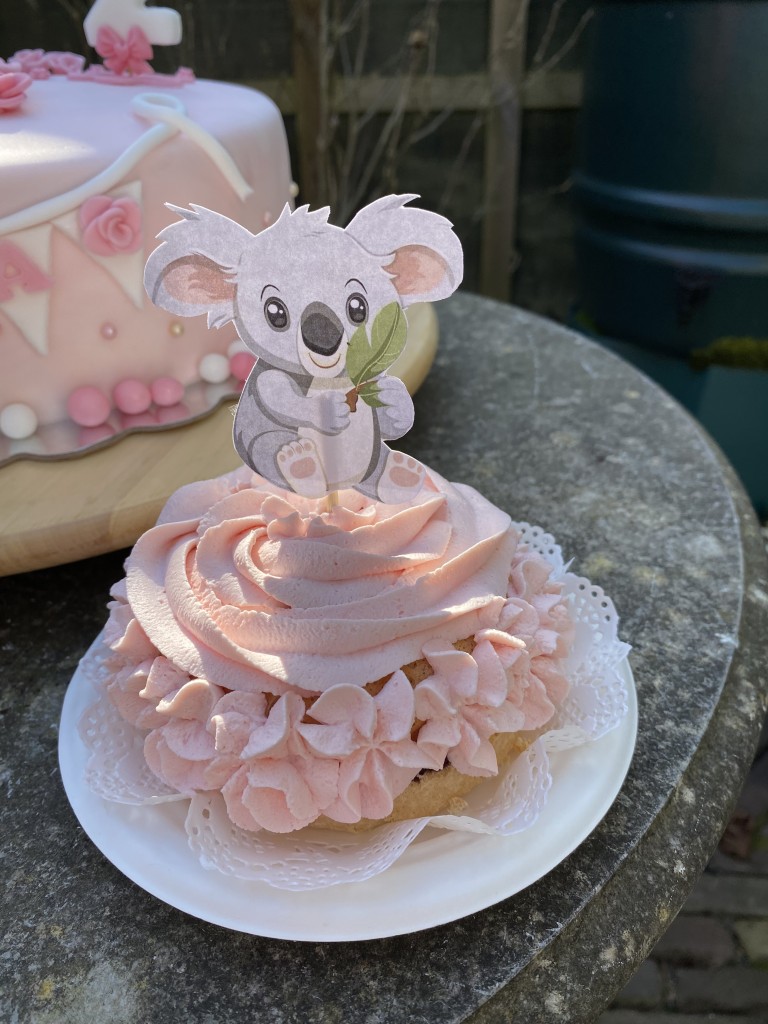 Het suikervrije cakeje is gevuld met een zelfgemaakte suikervrije blauwe bessen compote en suikervrije slagroom. Ook opgespoten met suikervrije slagroom. De zelfgemaakte papieren koala topper zorgt dat het taartje bij de grote taart past.