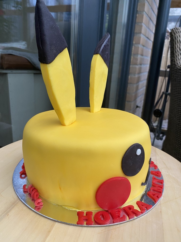 De Pikachu taart is gevuld met banketbakkersroom, verse aardbeien en aardbeienjam.