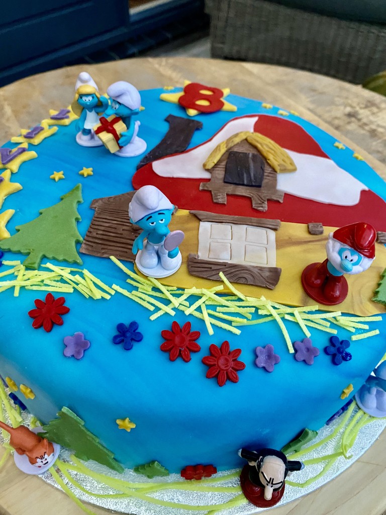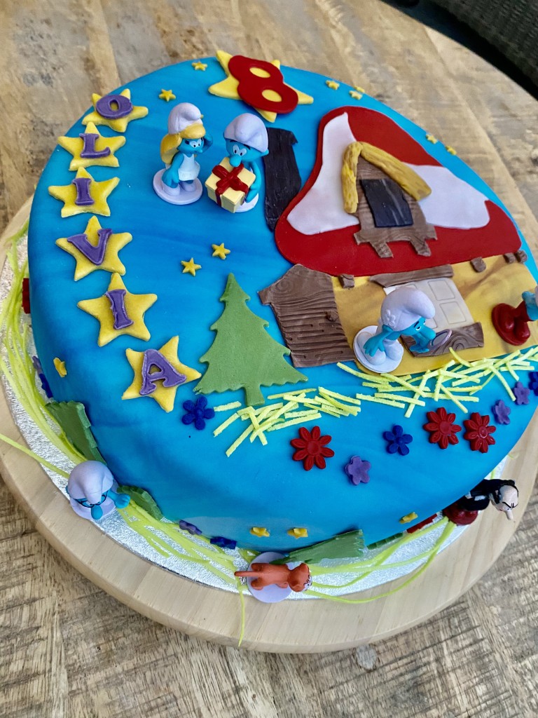 Deze super leuke taart is gevuld met frambozen, Chantilly Cream en frambozenjam. De smurfen zijn door de klant zelf gebracht om op de taart te kunnen plaatsen.