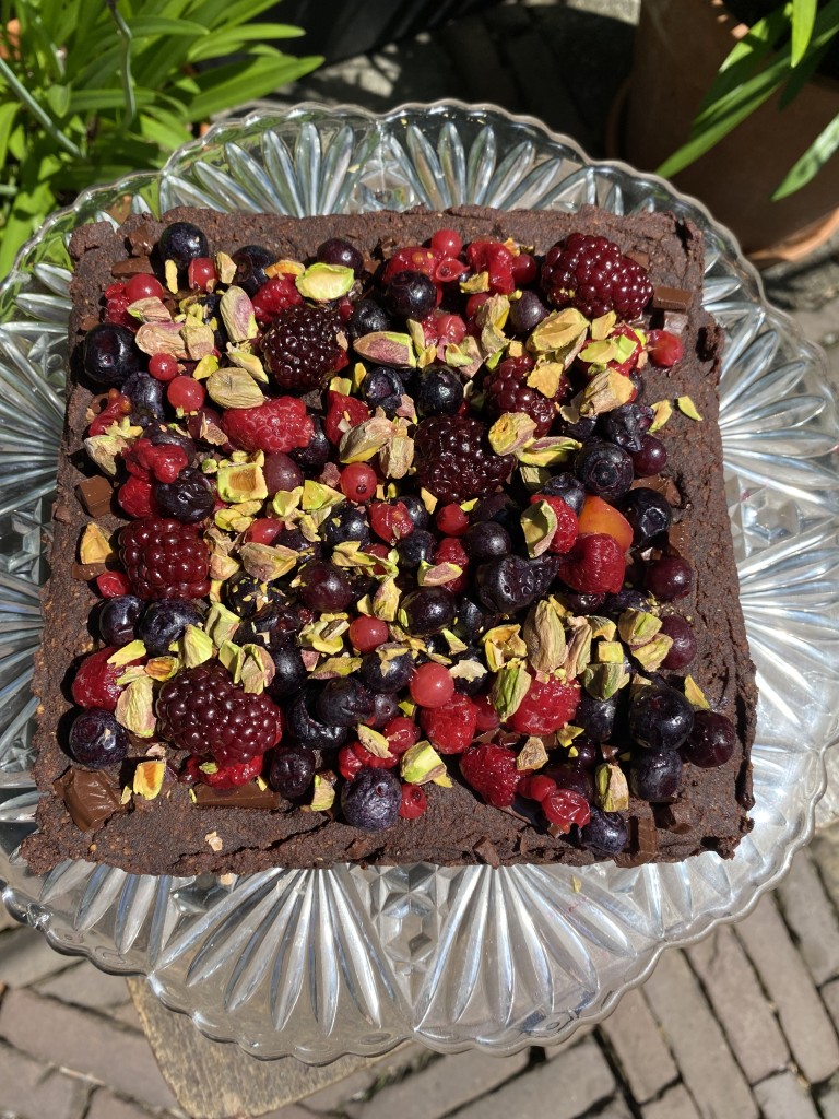 Zomerse zoete aardappel brownie met zomer fruit en pistachenoten